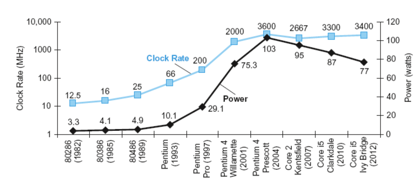 - 컴퓨터 성능을 높이기 위해 clock rate를 높일수록 power도 같이 높아지고 이로 인해 PC의 열이 높아져 식혀야하는 cooling