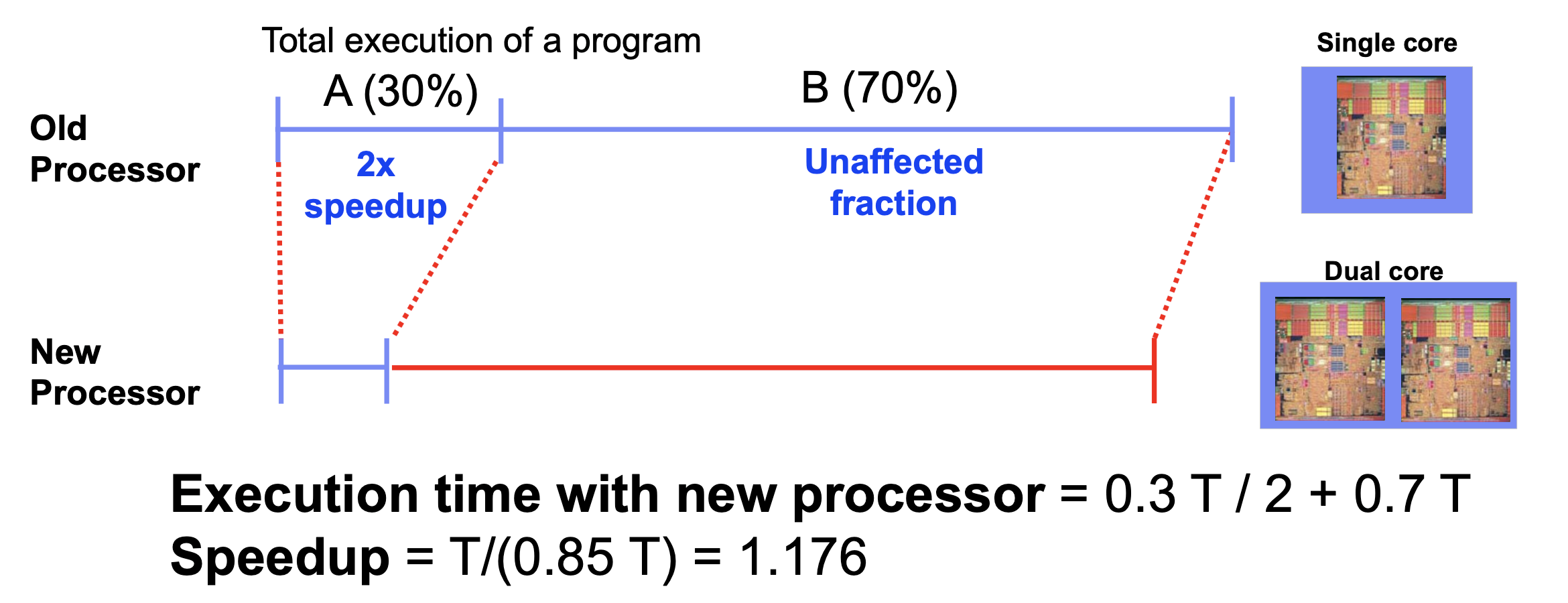 - 병렬 컴퓨팅에서 멀티 프로세서를 사용할 때 성능 향상은 프로그램의 순차적인 부분에 의해 제한