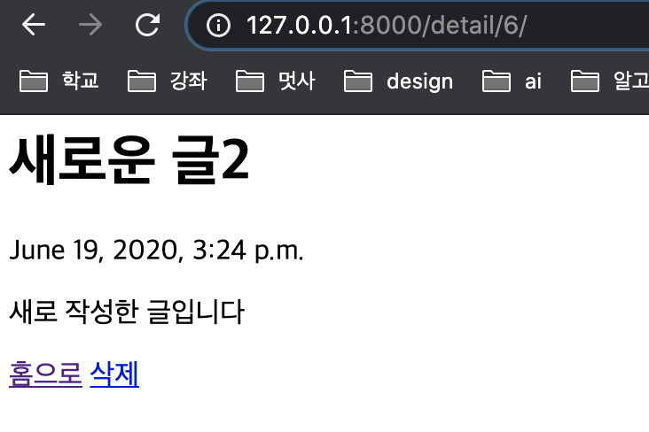 삭제 버튼을 누르면 글은 삭제되고 redirect 메소드에서 지정해준 '/'으로 되돌아가는 것을 확인할 수 있음