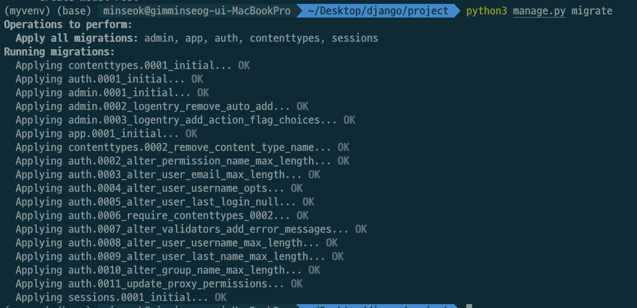 migration은 models.py 내에서 정의한 class를 데이터베이스에 동기화하는 작업이다.