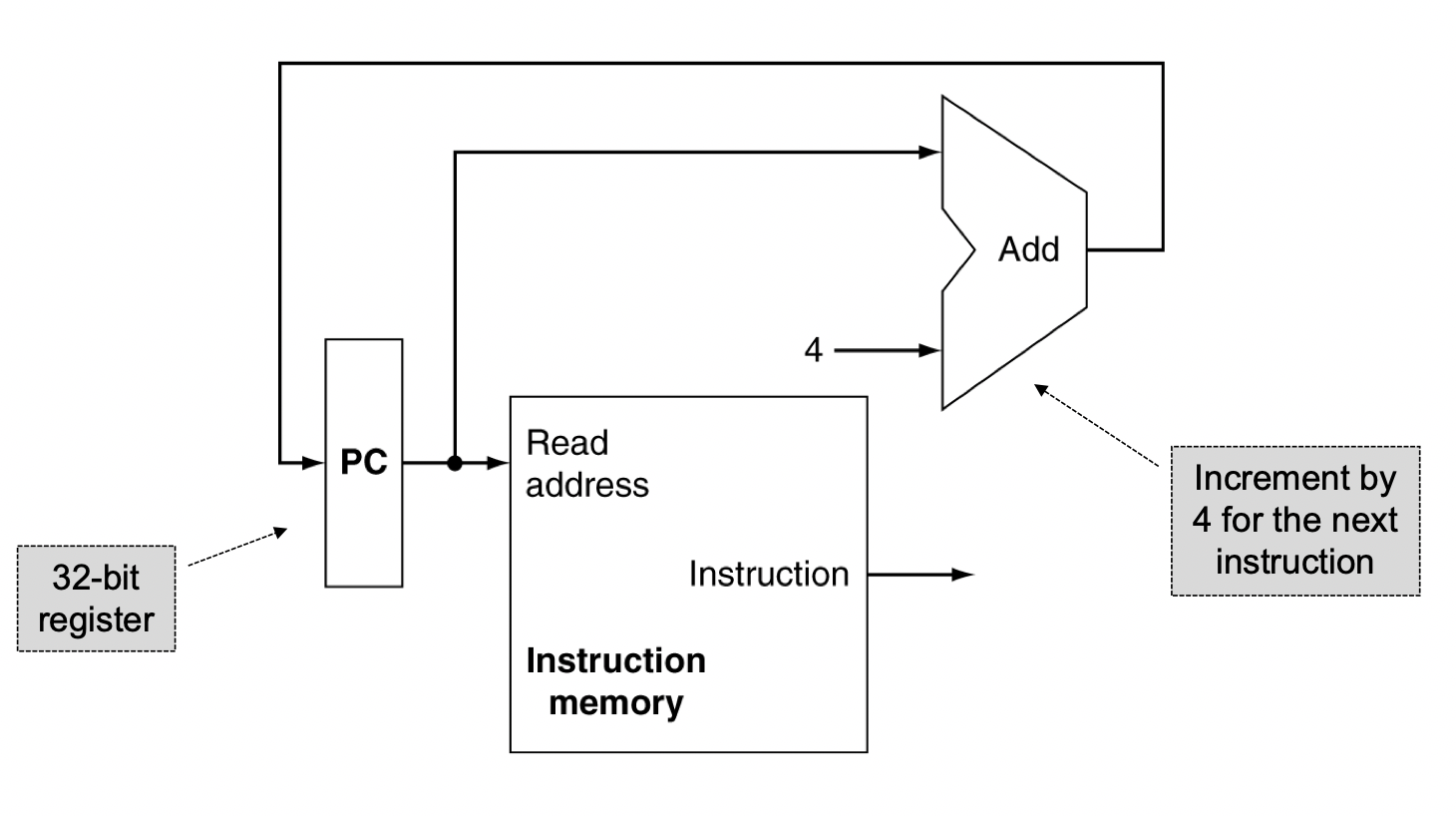 3) Add : PC 값을 4byte 씩 증가시키는 연산 수행하므로써 다음 명령어의 주소값으로 PC를 업데이트 시켜줌