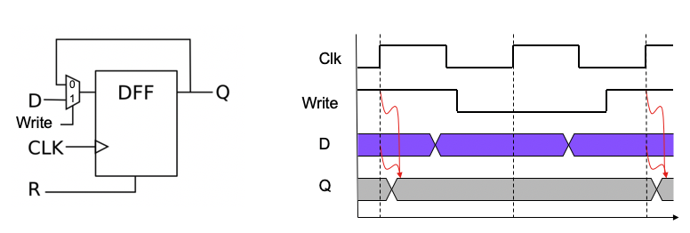 - 플립플롭에 write signal을 추가하여 클럭 엣지이면서 write signal이 1일 때만 값이 변경됨