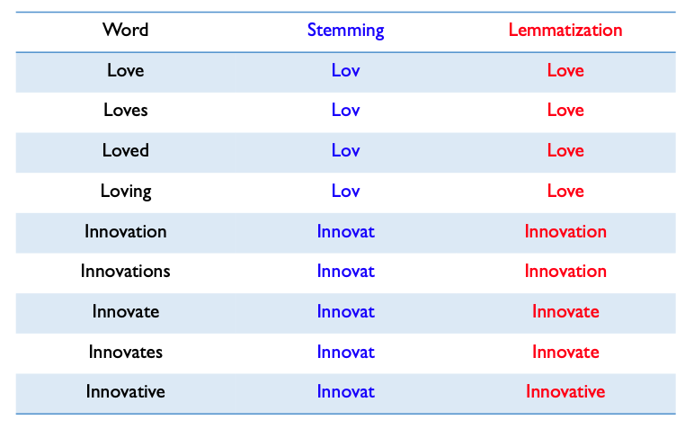 - 이 과정에서 사용되는 주요 기법으로 Stemming(어간 추출)과 Lemmatization(표제어 추출)이 있다.