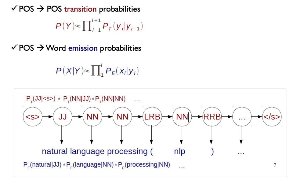 - 문자이 주어졌을 때 문장의 품사 시퀀스의 조건부 확률을 계산해 가장 높은 확률을 갖는 시퀀스를 선택