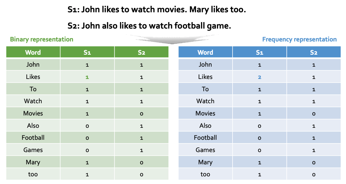 - 예를 들어, 위의 두 문장은 아래와 같이 벡터화가 된다.