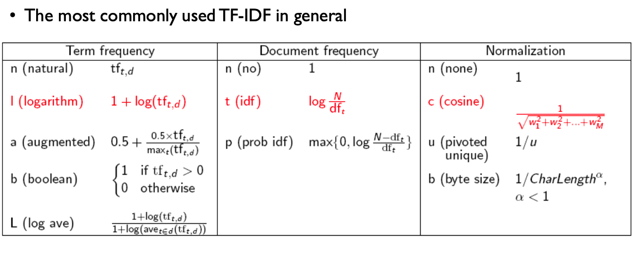 - n (no) : DF를 사용하지 않는다. 즉, 모든 단어에 대해 동일한 가중치를 사용한다.