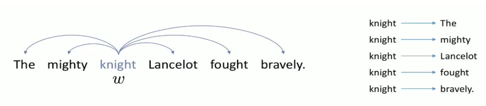 - 예를 들어, "I love machine Learning"에서, "machine"으로 ["I", "love", "learning"]을 예측한다.